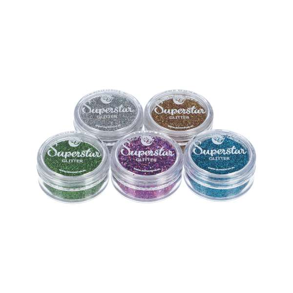 Superstar Glitter Set for Glitter Tattoo 5 x 5ml is de perfecte glitter set bij het aanbrengen van een glitter tattoo. Op een snelle en makkelijke manier kan je sprankelende accenten aan brengen. Gebruik hiervoor de Superstar Body Glue (art. nr. 139-92.1). De Superstar Fine Glitter bevat fijne Polyethelene Terepthalate glitter van cosmetische kwaliteit.