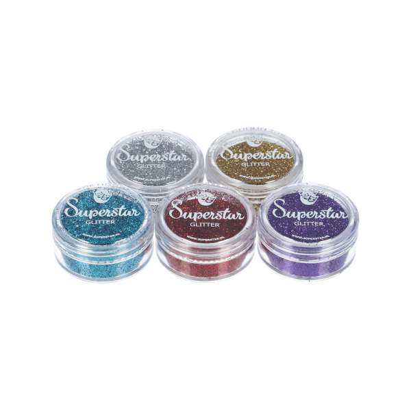 Superstar Glitter Set for Glitter Tattoo 5 x 5ml is de perfecte glitter set bij het aanbrengen van een glitter tattoo. Op een snelle en makkelijke manier kan je sprankelende accenten aan brengen. Gebruik hiervoor de Superstar Body Glue (art. nr. 139-92.1). De Superstar Fine Glitter bevat fijne Polyethelene Terepthalate glitter van cosmetische kwaliteit.