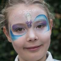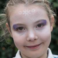 Dep heel licht wat wit 021 op het voorhoofd en wangen en zet hier met Silver White en een sjabloon de sneeuwvlokken ( no label snow flakes of ooh snow flip) op, breng eventueel gelijk glitters aan.
