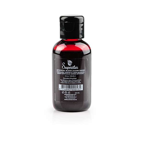 Het Superstar Nep Bloed Helder Dik is een mooi en helder kunstbloed. Een wond wordt bloedstollend eng!  Het is vrij dik en blijft mooi op de aangebrachte plek zonder uit te lopen en kan gebruikt worden voor het maken van bloederige wonden. Het bloed stolt. Door licht en donker bloed te combineren creëer je een mooi resultaat.  Ideaal voor wonden en Halloween.