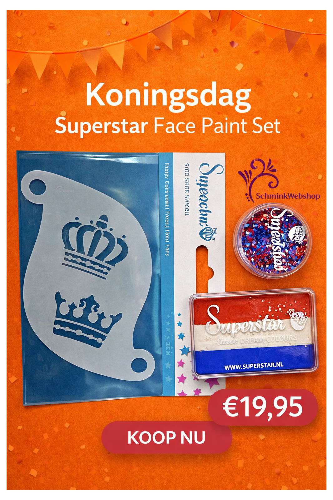Maak van Koningsdag een feestje voor je kind(eren) met deze vrolijke schminkset!. Met de rood-wit-blauwe little dreamcolour, een koniklijk sjabloon en sprankelende glittercream tover je in een paar minuten een feestelijke look op elk gezicht.
