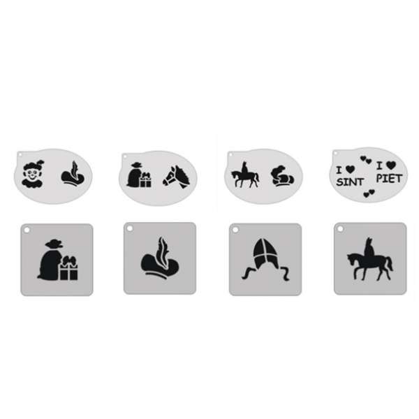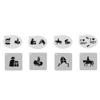 4 herbruikbare sjablonen van 12x9 cm en 4 sjablonen van 7x7 cm.De afbeeldingen zijn gelijk aan de foto.