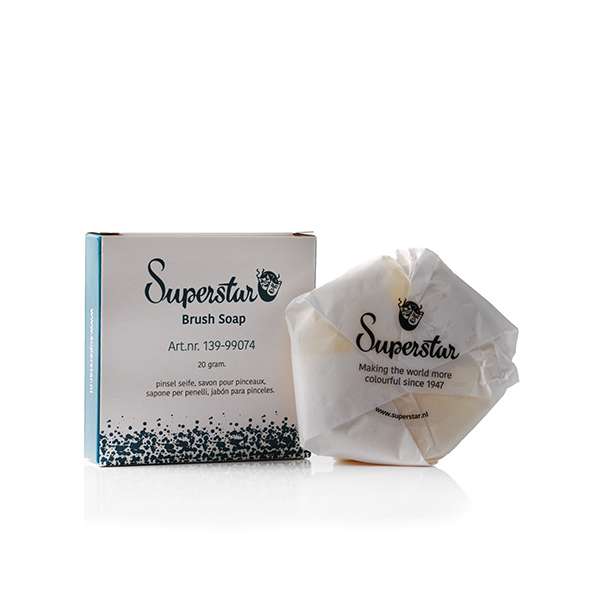 De Superstar penselenzeep is speciaal ontwikkeld om je schminkpenselen goed te reinigen en zorgt voor het behoud van de elasticiteit en zachtheid van de haren. Geschikt voor alle haarsoorten. De zeep heeft een aangename citroengeur en is verpakt per stuk in een recyclebaar kartonnen doosje.