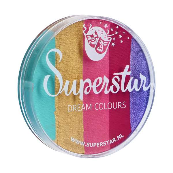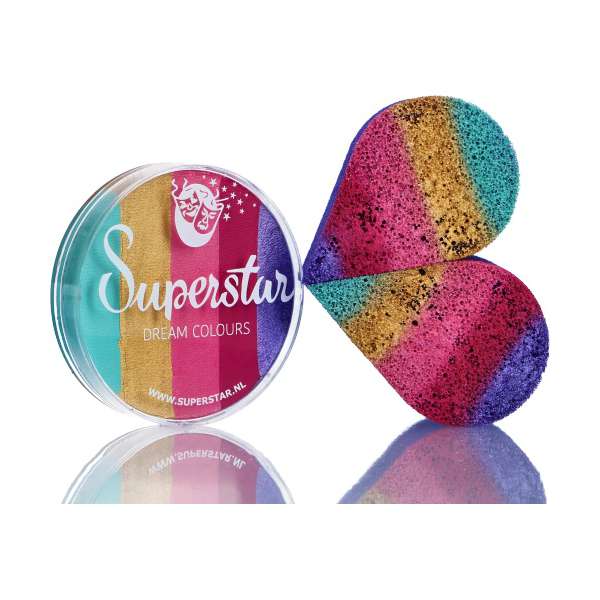 De Dream Colours Splitcake Schmink van Superstar is een hoogwaardige waterschmink met prachtig gecombineerde kleuren. Ook bekend als rainbowcake of splticake biedt deze schmink een soepele applicatie en intense dekking.