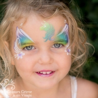 Je houdt het sjabloon op de droge schmink en met een schminksponsje of een vingersponsje, geladen met een contrasterende kleur, dept je over het sjabloon.